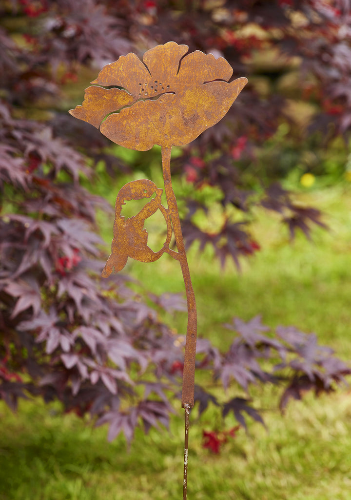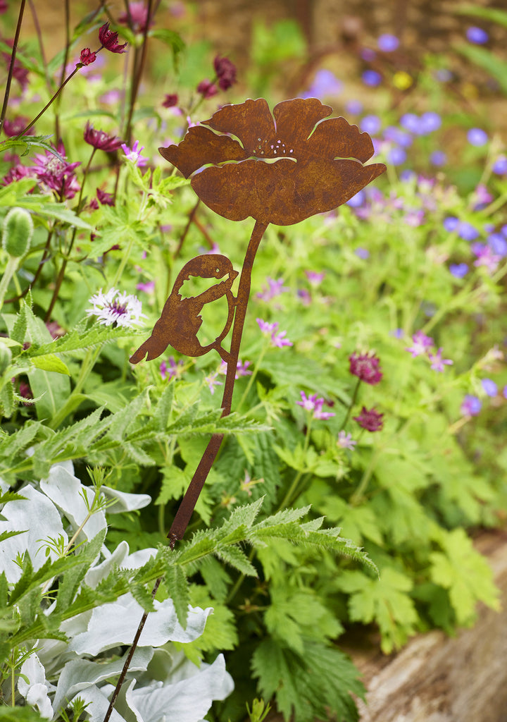 A rustic iron plant stake featuring a cut-out poppy with a cute perched blue tit on the stem and perfect support for plant life in borders and pots.
