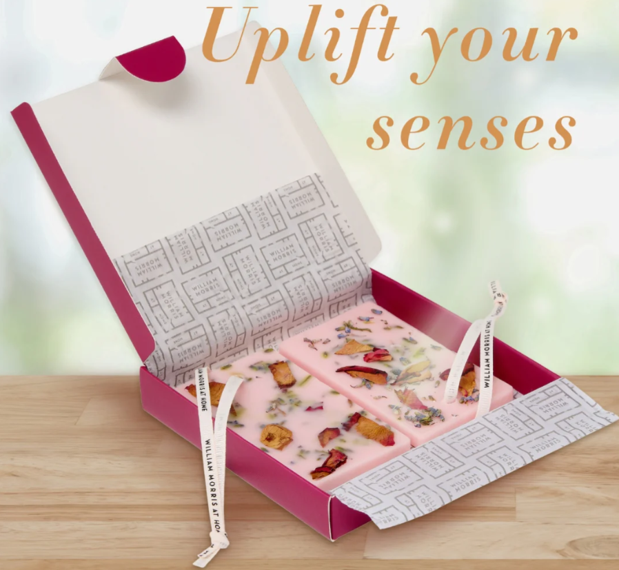 - Each wax tablet is finished with a hanging ribbon, wrapped in tissue and tucked inside a reusable box featuring Morris’s iconic Strawberry Thief design.
